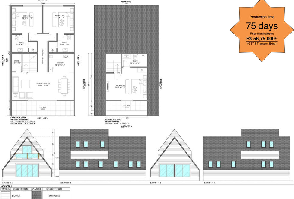 Perfect for hill stations, forest plots, or any scenic getaway, the Cabana “A” is a high-performance prefab villa with a production time of just 75 days. It offers durability, energy efficiency, and sustainability – a smart investment for hospitality projects or individuals looking for a premium modular living solution.